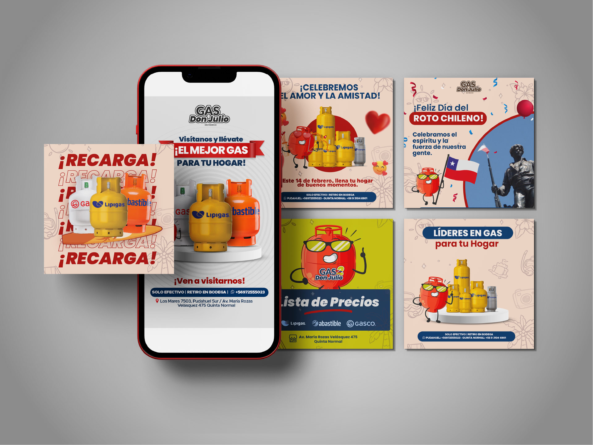 Motogas es una empresa chilena dedicada a la distribución de gas, operando a través de cuatro marcas: Don Julio, Rey del Gas, Lipiestación y Lipirecoleta. Con el objetivo de fortalecer su identidad visual y presencia digital, se desarrolló una estrategia integral de comunicación y diseño. Las acciones implementadas incluyeron el desarrollo de identidad visual, diseño para redes sociales y creación de anuncios publicitarios, buscando una comunicación coherente y efectiva con su audiencia.
