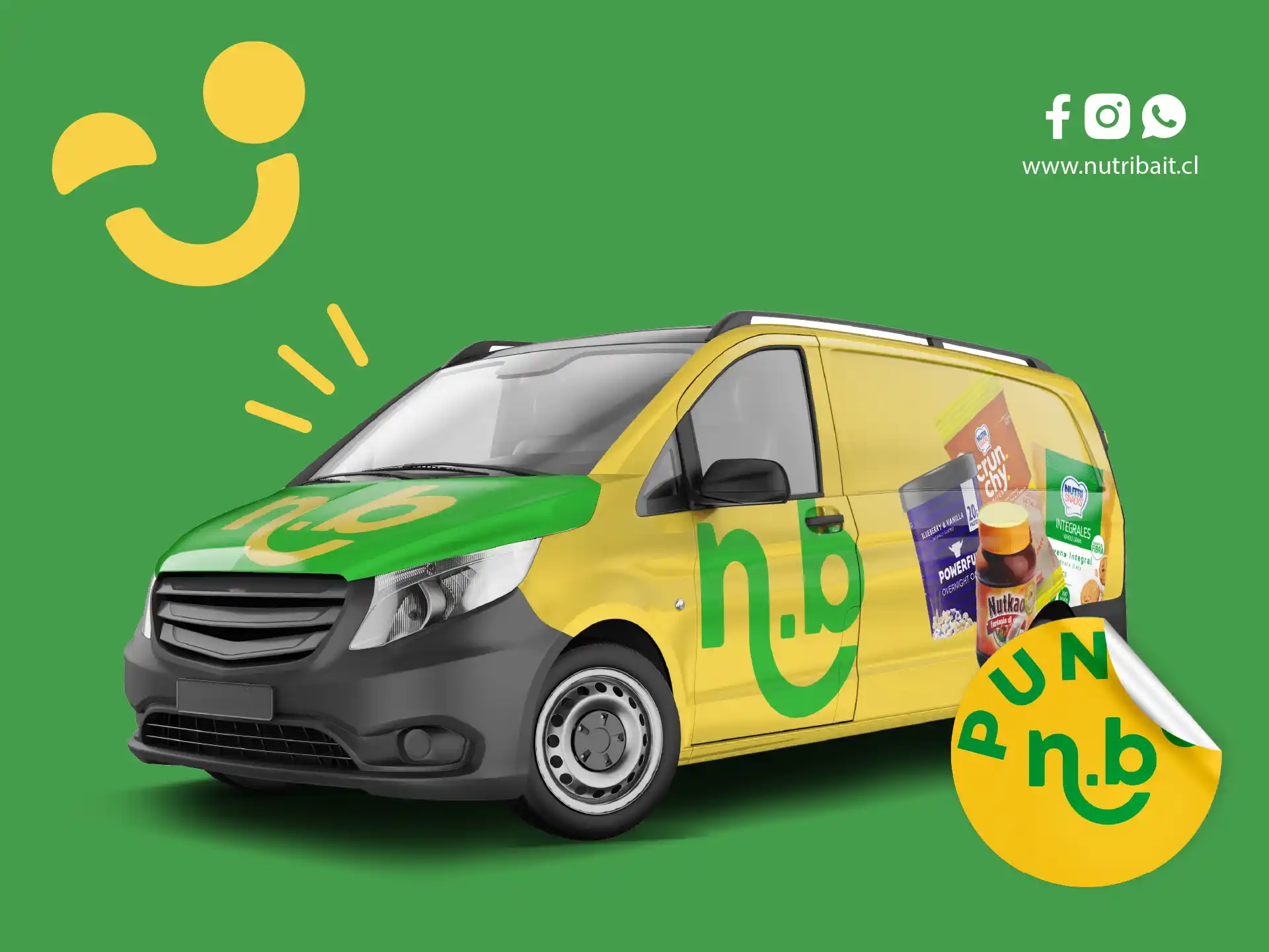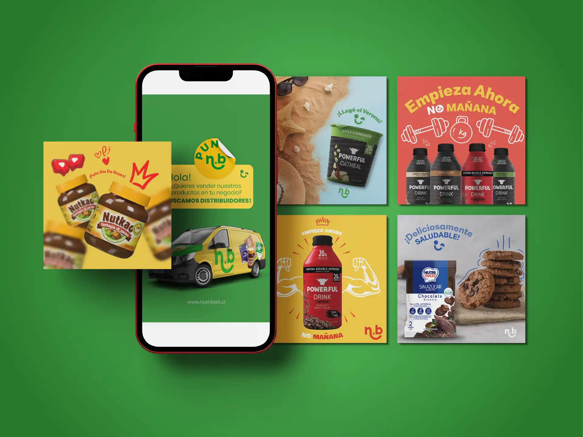 n.b (NutriBait) es una marca chilena especializada en la distribución de alimentos saludables, snacks funcionales y productos sin azúcar, orientados a promover una alimentación equilibrada. Su catálogo incluye marcas como Powerful Drink, Nutkao y Crunchy, las cuales son distribuidas a través de canales retail y venta directa. El trabajo realizado consistió en la creación de piezas gráficas para redes sociales y campañas promocionales. La identidad visual se centró en una estética positiva, colorida y cercana, diseñada para conectar con consumidores conscientes del bienestar, incentivando la distribución de sus productos a nivel nacional.